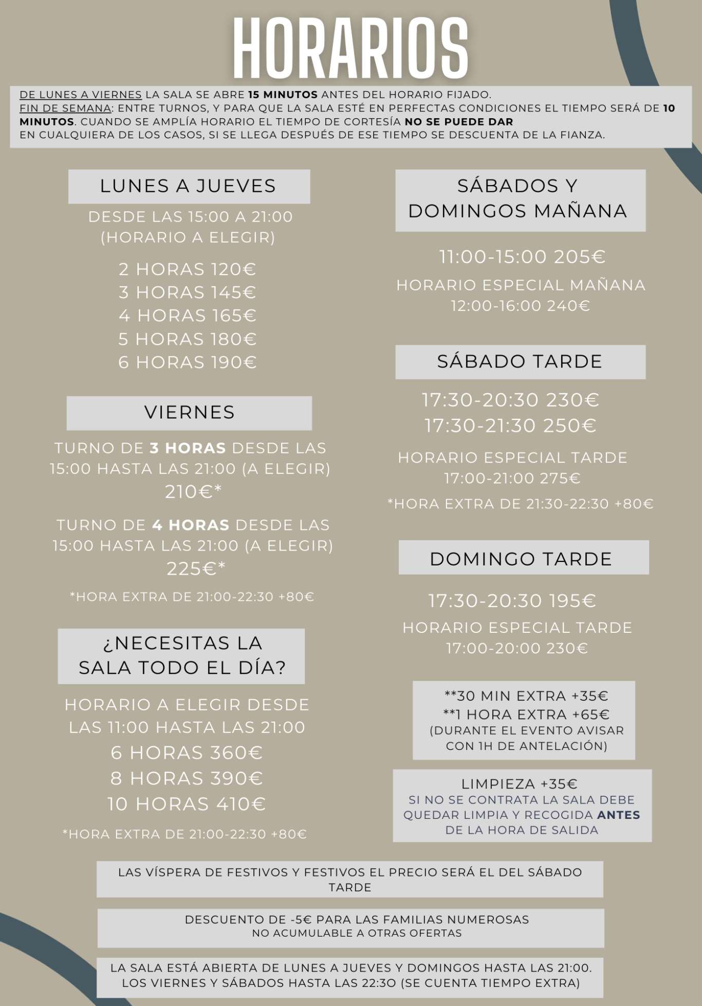Siempre 15 minutos antes de la hora fijada para explicaros las normas, firmar el contrato y abonar el importe de la sala. Es IMPORTANTE la puntualidad para que el personal también cumpla con sus horarios. En caso de llegar o salir más tarde de la hora marcada se cobrará de la fianza el tiempo de espera.